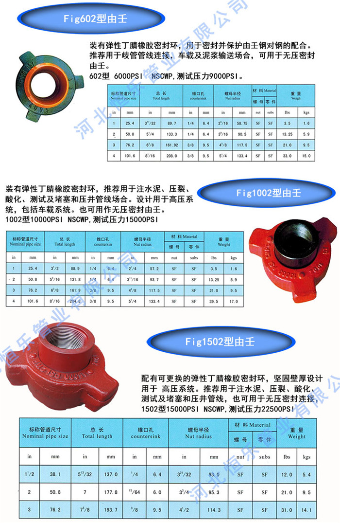 【高中低壓由壬】是河北恒樂管業有限公司的產品之一,包括Fig50型由壬、Fig100型由壬、Fig200型由壬、Fig206型由壬、Fig207型由壬、Fig400型由壬、Fig602型由壬、Fig1002型由壬、Fig1003型由壬、Fig1502型由壬、Fig2202型由壬、氣胎由壬、伸縮式鋼由壬、尼龍由壬、由壬密封墊、由壬三通、由壬接頭等