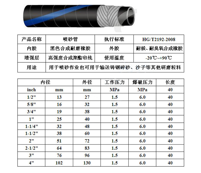 耐磨噴砂膠管,是物料輸送管的一種。常見黑色、亞黃色或透明;外膠打包帶包裹居多,常見內外膠之間帶鋼絲以適用負壓工況。